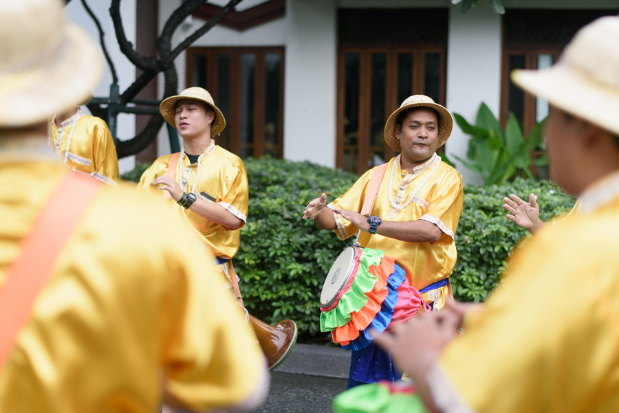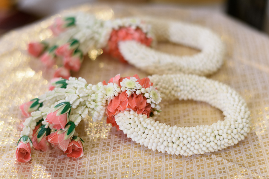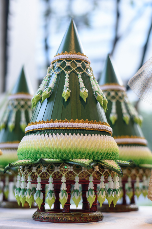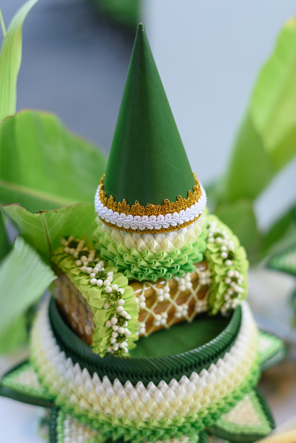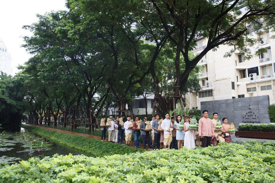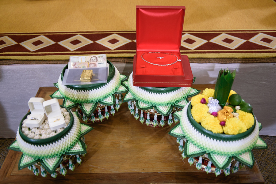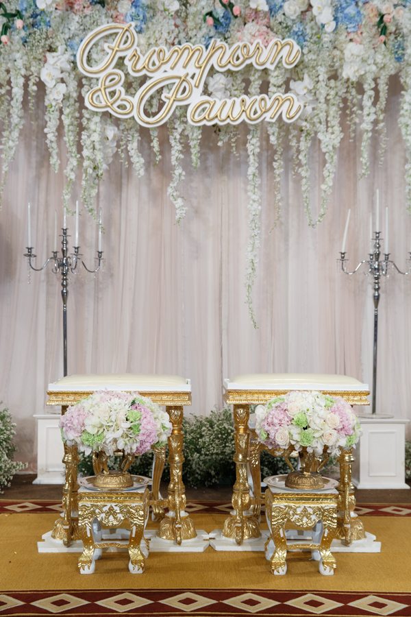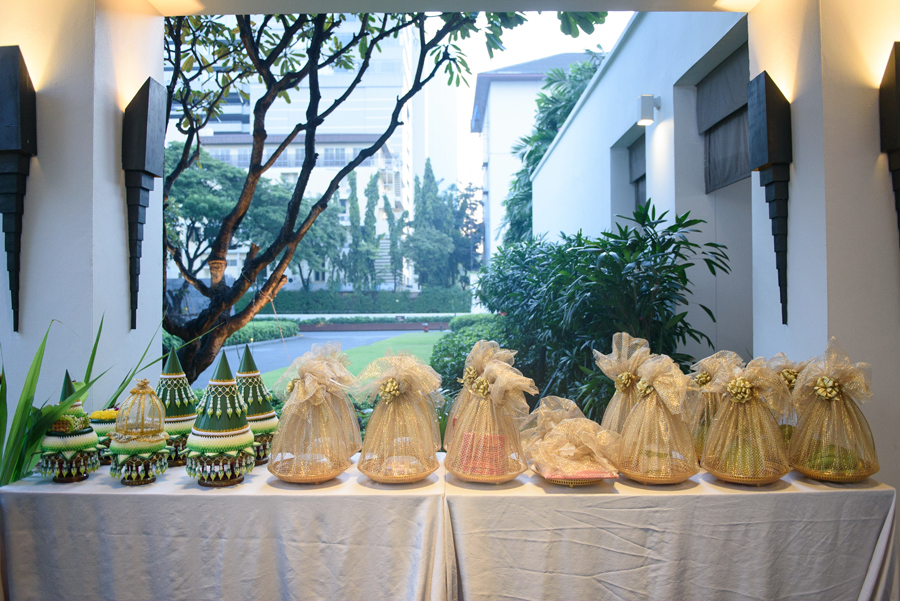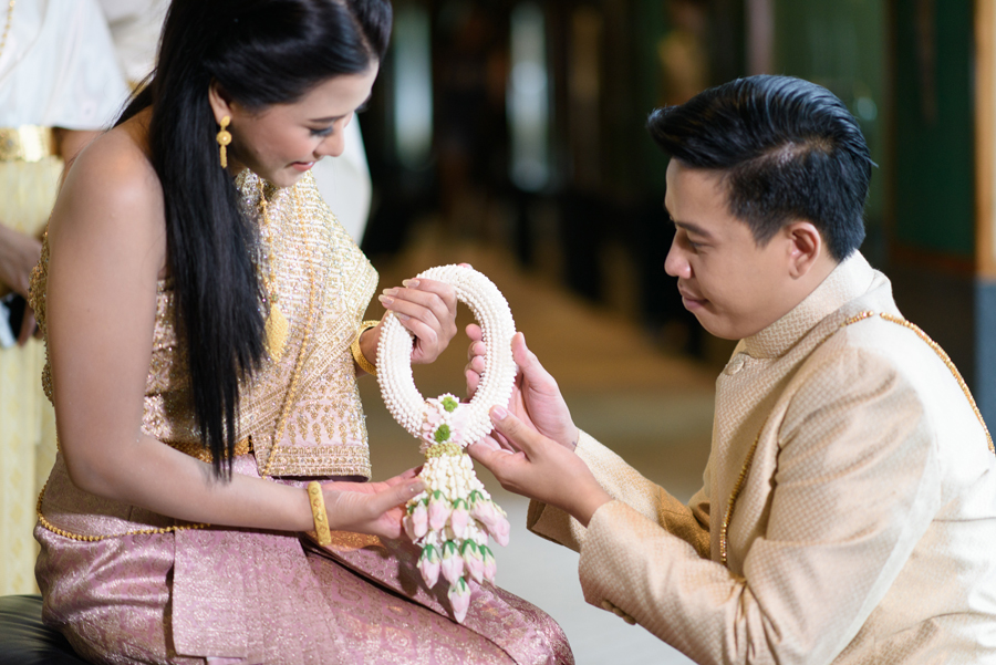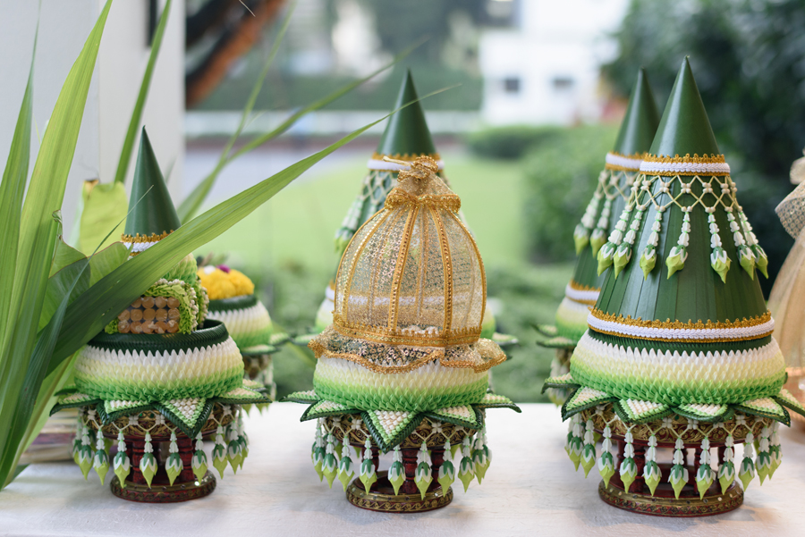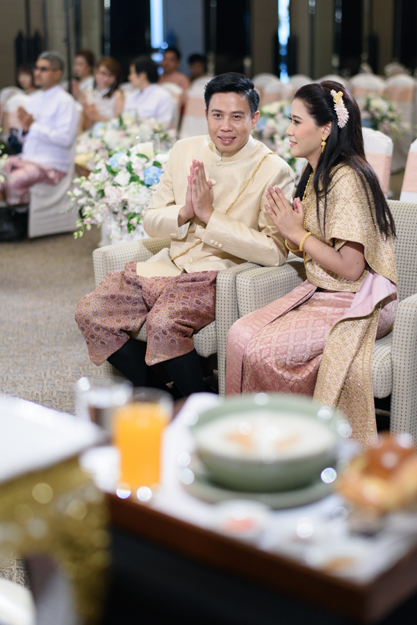 งานพิธีไทยเน้นความเป็นไทยในแทบทุกรายละเอียด ตั้งแต่การแต่งตัวของบ่าว-สาวและกลุ่มเพื่อนเจ้าสาว ไปจนถึงลำดับพิธีต่างๆ ทั้งขบวนขันหมากที่มีขบวนกลองยาวและนางรำนำมาอย่างสนุกสนานช่วงพิธีการสู่ขอก็ละลานตาไปด้วยเครื่องทองโบราณอันวิจิตร ผลงานช่างทองหัตถศิลป์ฝีมือชั้นครู และงานรับไหว้แสนอบอุ่นที่กรุ่นกลิ่นมาลัยดอกพุดจากไอเดียเจ้าสาว เป็นงานแต่งงานที่อบอุ่นและดีต่อใจแบบที่คุณอ้อมและคุณโน๊ตตั้งใจไว้ไม่ผิดจริงๆ