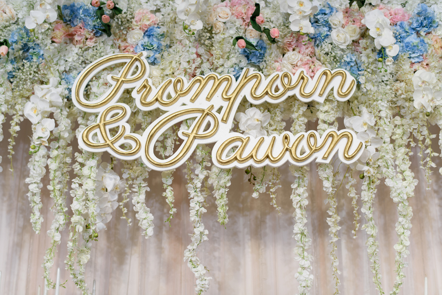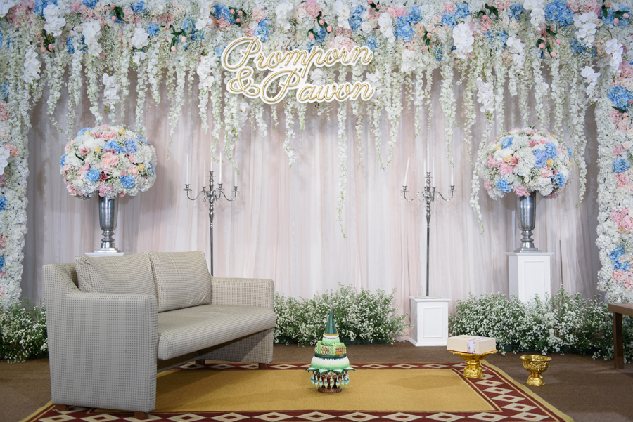 คุณอ้อมและคุณโน๊ตเลือกจัดงานที่โรงแรมสุโขทัย ซึ่งเป็นสถานที่ที่ถูกใจทั้งคู่มากๆ เพราะมีความเรียบหรูและมีกลิ่นอายแบบไทยแท้ ทั้งยังร่มรื่นไปด้วยสวนสวยและต้นไม้ใหญ่เขียวขจี โดยการตกแต่งในบริเวณงานใช้ธีมสีหลักเป็นพาสเทลอ่อนอย่างชมพู ฟ้า และขาว จากดอกไม้หลากชนิด ทั้งลิลี่ กุหลาบ ไฮเดรนเยีย กล้วยไม้ แคสเปีย และยิปโซ ทำให้บรรยากาศของงานดูสวยสะอาดตาน่ามองตรงใจทั้งเจ้าบ่าวและเจ้าสาว
