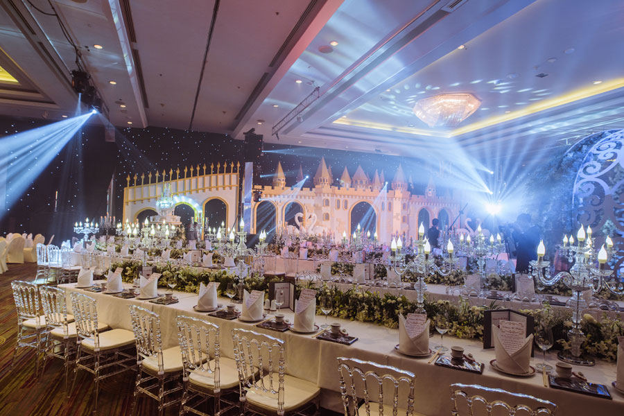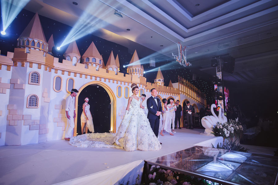 งานฉลองมงคลสมรสจัดขึ้นในธีม Princess ซึ่งเป็นธีมในฝันของเจ้าสาวคนสวย ตั้งแต่แบ็กดร็อปที่สร้างสรรค์เป็นปราสาทสีทองที่ให้ความรู้สึกหรูหรา ดอกไม้สีขาวเลื้อยประดับซุ้มลวดลายอ่อนหวานแซมด้วยดวงไฟดูสวยงามตระการตา ทางเดินเข้างานเป็นแกลเลอรี่ภาพพรีเวดดิ้งสุดปังที่ทั้งคู่เดินทางร่วมกันไปเก็บภาพแสนประทับใจจากทั้งอิตาลี