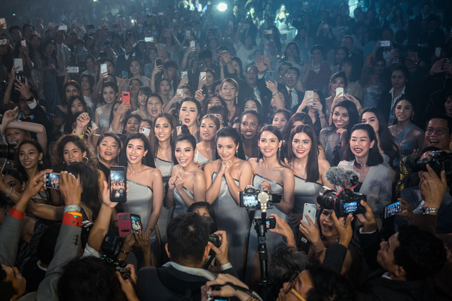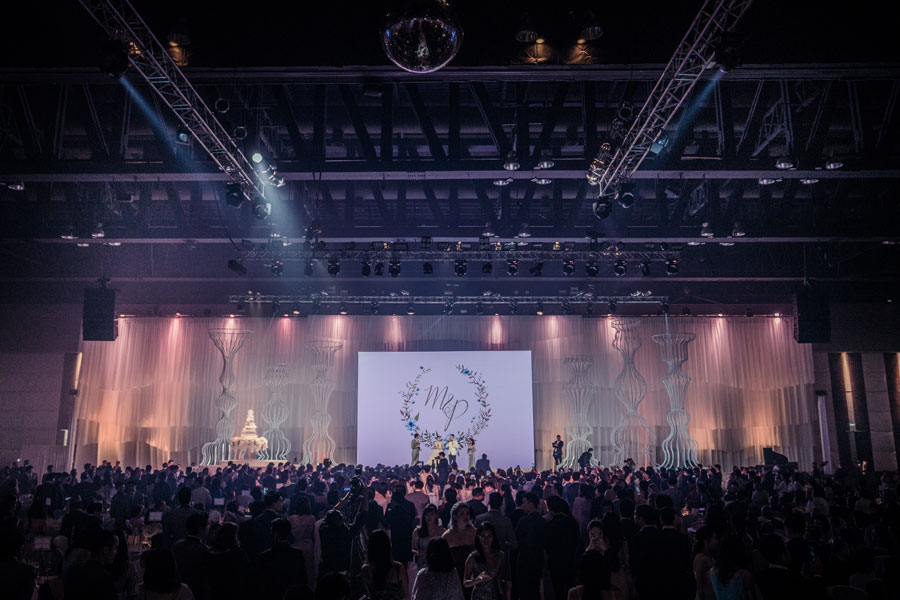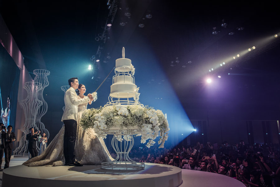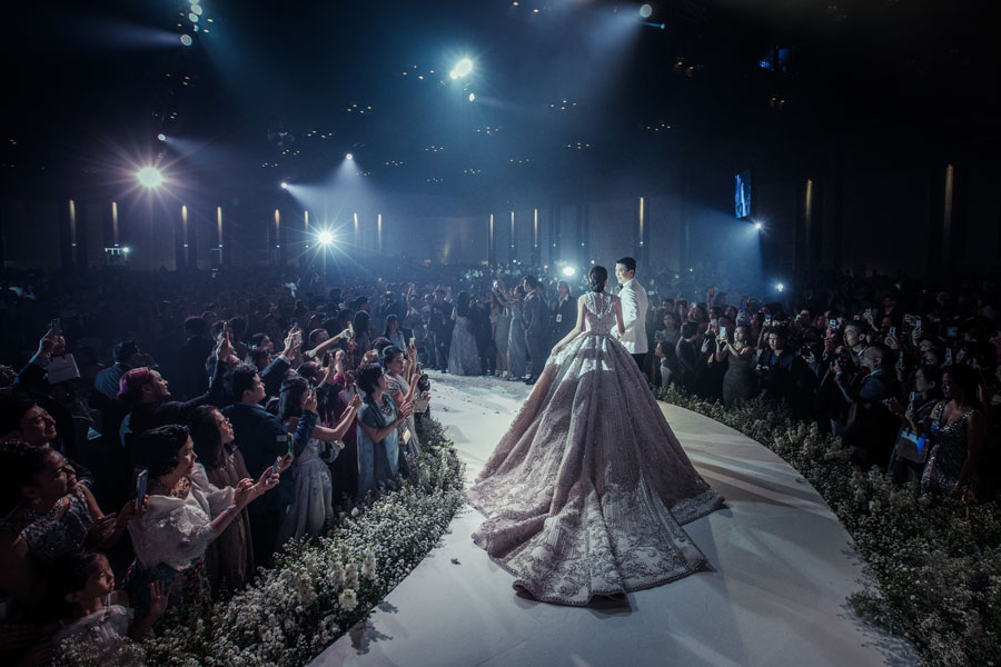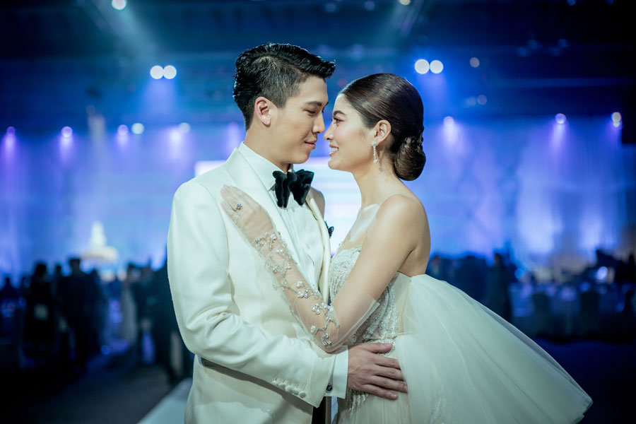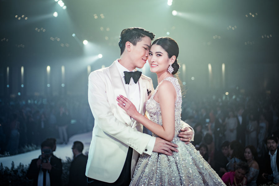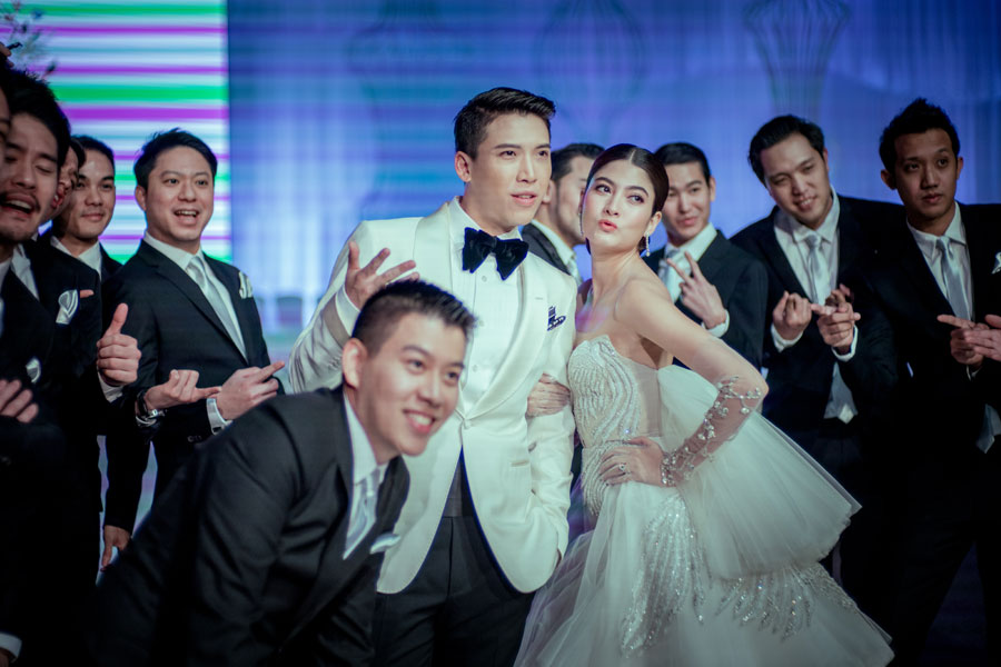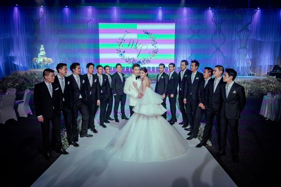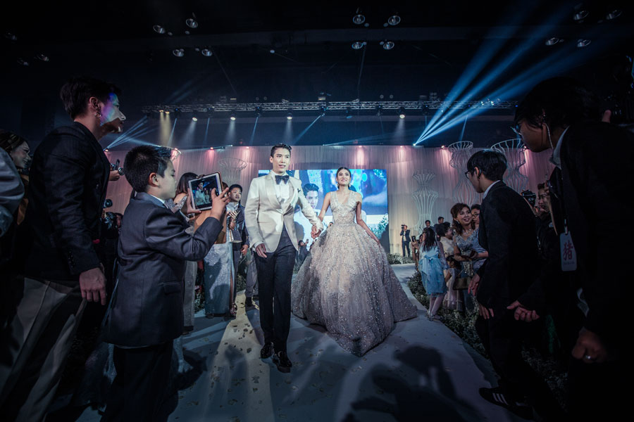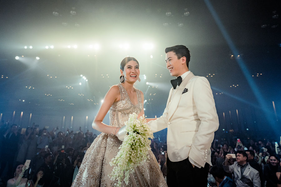 ก่อนที่จะถึงช่วงที่ทุกคนในงานรอคอยเมื่อพิธีกร เดี่ยว-สุริยนต์าและเจิน-ณิชชาพัณณ์ เปิดตัวบ่าว-สาว โดยคุณป๊อกมาในเสื้อทักซีโดสีขาวผูกโบไทสีดำและกางเกงสแล็คสีดำ ส่วนคุณมาร์กี้เจ้าสาวคนสวยมาในชุดเกาะอกปักเลื่อมลายนกกระเรียนเป็นดีเทลช่วงบนกระโปรงผ้าซีทรูซ้อนทับกัน 3 ชั้นที่ด้านหลัง สวมถุงมือซีทรูปักเลื่อมสีขาวให้ความรู้สึกหรูหราแต่ไม่มากเกินไป จากนั้นเจ้าสาวได้เปลี่ยนเป็นชุดแขนกุดทรงบอลกาวน์ปักคริสตัลสวารอฟสกี้ทั้งตัวสุดอลังการที่มีน้ำหนักมากถึง 35 กิโลกรัม เพื่อเข้าสู่ช่วงพิธีการบนเวที ช่วงตัดเค้ก จนถึงเวลาโยนดอกไม้เลยทีเดียว