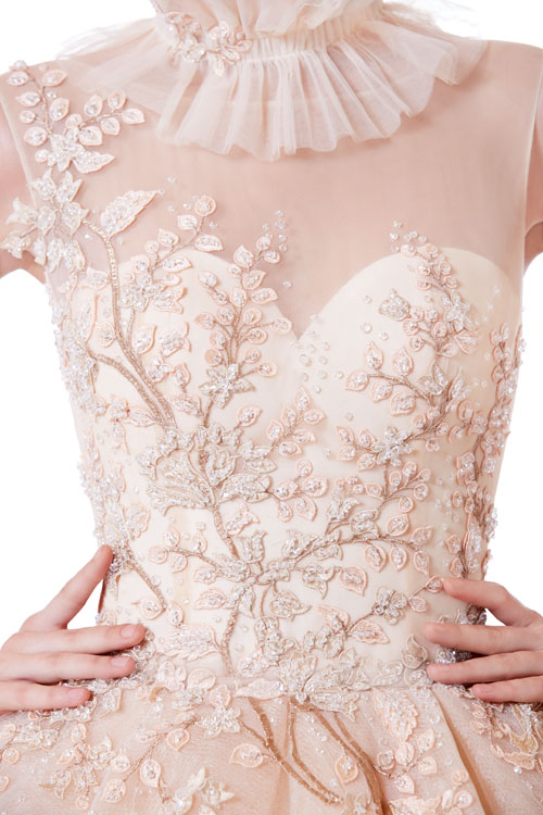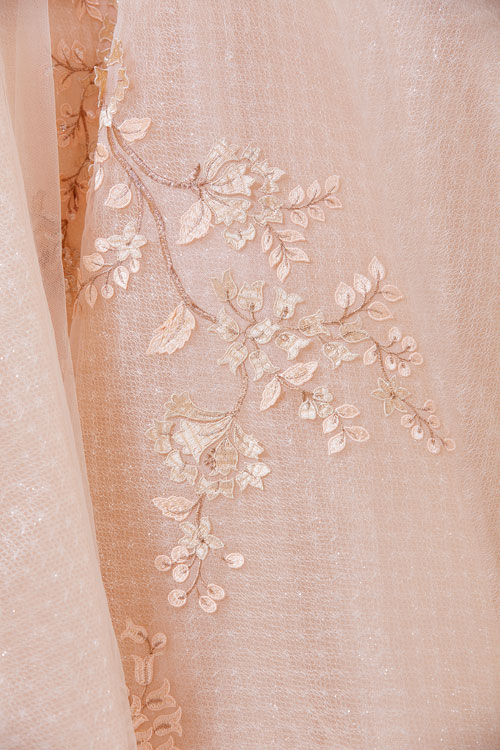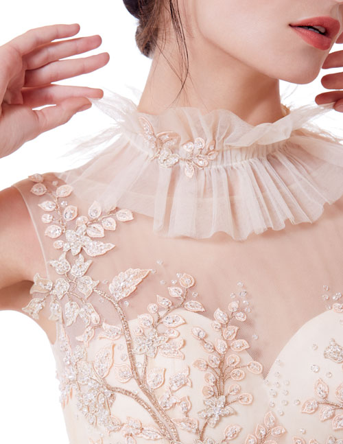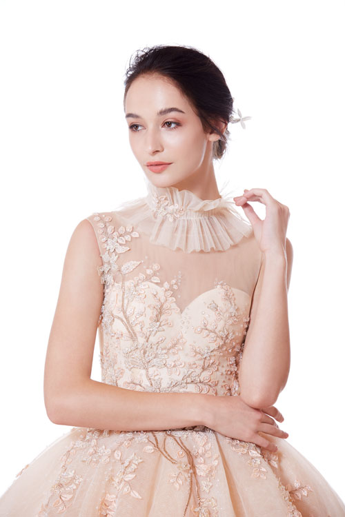 ชุดทรงบอลกาวน์ซีทรูแขนกุดสีโอลด์โรสชุดนี้เป็นคอลเล็กชั่นใหม่ล่าสุดของทางร้าน เพื่อให้เจ้าสาวหลีกหนีความจำเจจากชุดเจ้าสาวสีขาวแบบเดิมๆ จึงเลือกใช้สีโอลด์โรสมาเพิ่มความหวาน มีการปักลายใบไม้ซึ่งเป็นลายที่ทาง BOBO Studio ปักขึ้นลายเองอย่างประณีตงดงามและมีเพียงชิ้นเดียวในโลก ส่งให้เจ้าสาวที่สวมใส่ชุดนี้ดูสวยงามสง่าดุจเจ้าหญิงยิ่งขึ้น
