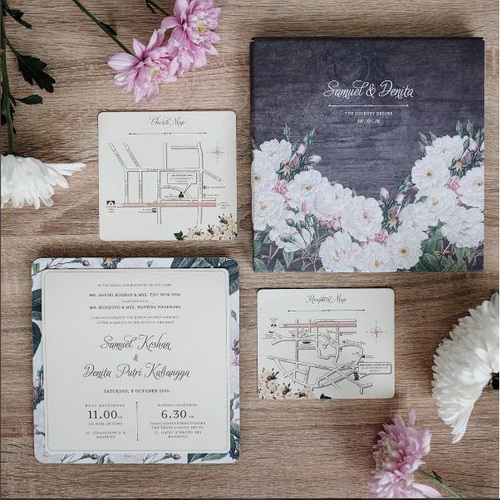 เจ้าสาวสายหวานรักดอกชอบดอกต้องรักร้านการ์ดจากอินโดนีเซียร้านนี้ เพราะมีลายดอกไม้หลายชนิดหลายสีให้เลือกมาโปะลงในการ์ด โดยตัวลายดอกไม้ของร้านมีลักษณะคล้ายภาพเขียนสีน้ำที่ลงสีได้อ่อนช้อย แถมบ่าวสาวยังสามารถเลือกแบบ ลาย สี ลูกเล่นต่างๆ ให้ทางร้านออกแบบใหม่เป็นพิเศษ ก่อนสั่งพิมพ์และจัดส่งให้ถึงหน้าบ้านแดนไทยเลนด์ แต่อาจต้องเผื่อเวลาสั่งทำ ออกแบบ และขนส่งมากกว่าปกตินิดนึง แต่ไม่เป็นไรหรอกเนอะ เพราะได้หมด ถ้าเจ้าสาวแฮปปี้