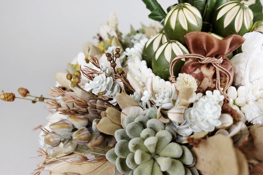 ขอย้ำตรงนี้ว่าแม้จะเป็นงานดีไซน์ร่วมสมัย แต่ ปิ-ติ ก็ใส่ใจในทุกรายละเอียดแม้จะเป็นสิ่งเล็กๆ เพราะทั้งหมดคือการออกแบบใหม่เพื่อให้งานออกมาสวยเพอร์เฟ็ค สมใจบ่าวสาวไม่ว่าจะเป็นชุดพานขันหมาก พานรับขันหมาก สายกั้นประตูเงินประทอง ยันเครื่องสังฆทานถวายพระ แต่ถ้าบ่าวสาวอยากได้เลยเถิดไปจนถึงช่อรับดอกไม้รับตัวเจ้าสาวหรือช่อบูโทเนียร์ติดอกแน่นๆ ของคุณเจ้าบ่าว เขาก็สามารถคอมพลีทลุคทั้งหมดให้ได้แบบวันสต๊อปเซอร์วิสเลยทีเดียว